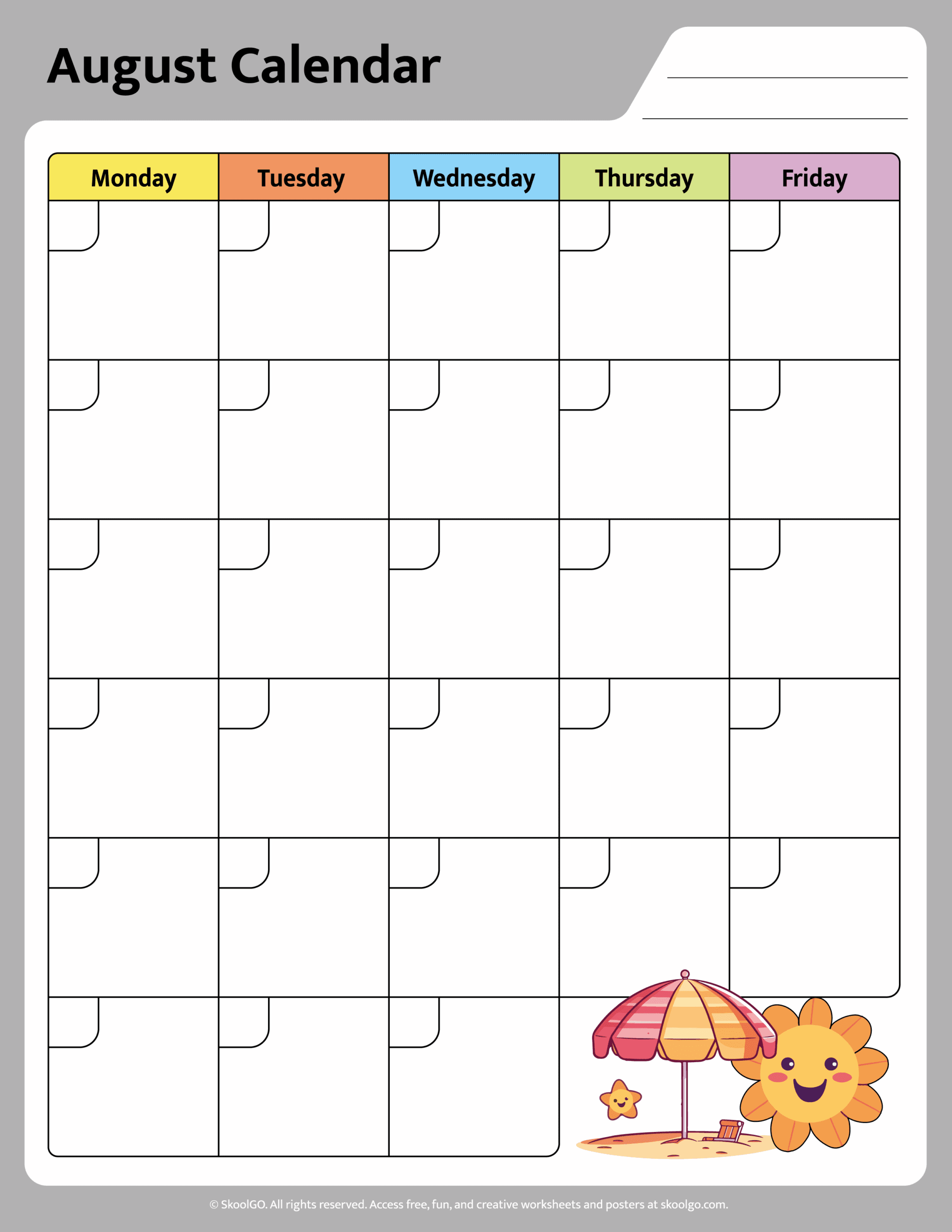 Start the new month with organization and creativity using this free printable August calendar worksheet! Designed especially for young learners, this resource helps children plan their days, track activities, and build essential organizational skills in a fun and engaging way. Whether at home or in the classroom, this calendar is a perfect companion for daily routines.