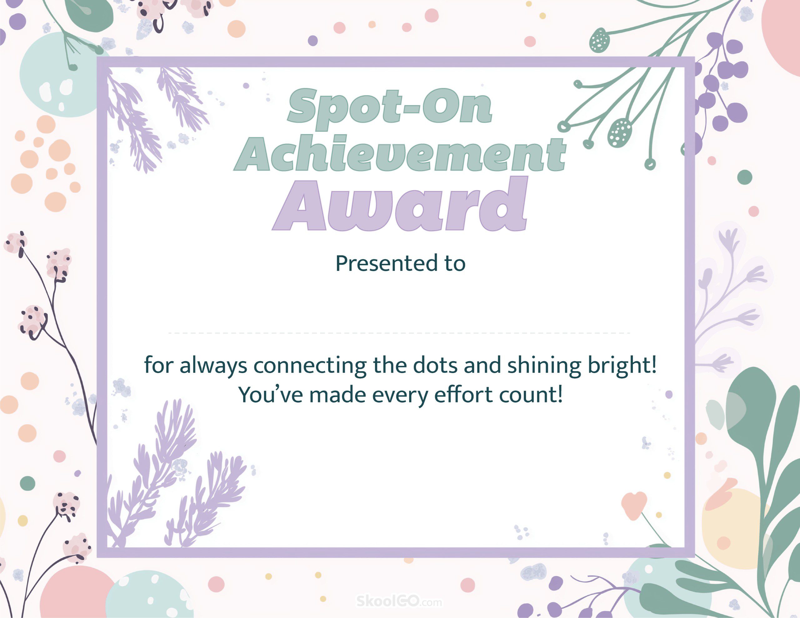 Celebrate effort, focus, and creativity with this beautiful Spot-On Achievement Award certificate template. Designed for young learners, this printable certificate is perfect for recognizing students who excel at connecting ideas, solving problems, and staying motivated. Whether used in classrooms, homeschool settings, or extracurricular activities, it adds a meaningful touch to every achievement.