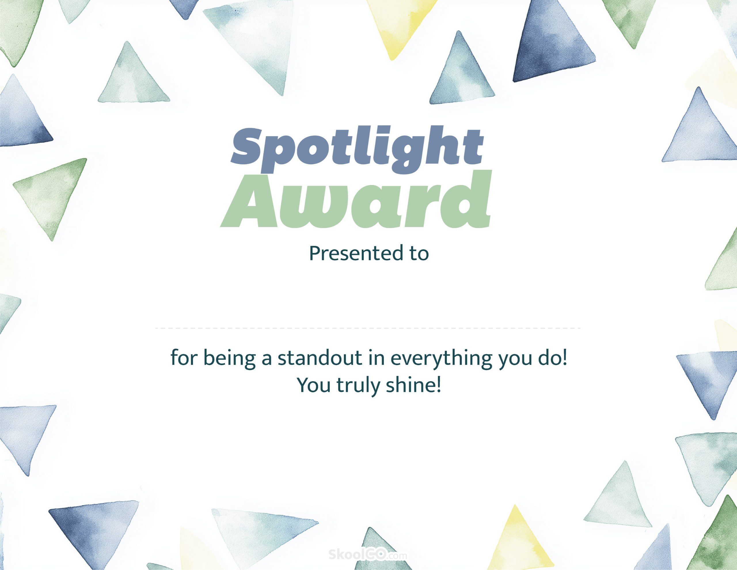 This Spotlight Award certificate is thoughtfully designed to highlight each child’s unique strengths and accomplishments. Featuring soft watercolor triangle illustrations in calming shades of blue, green, and yellow, the layout creates a modern yet playful look that feels both professional and student-friendly. The clean typography ensures that the main title stands out clearly, while leaving space for personalization.