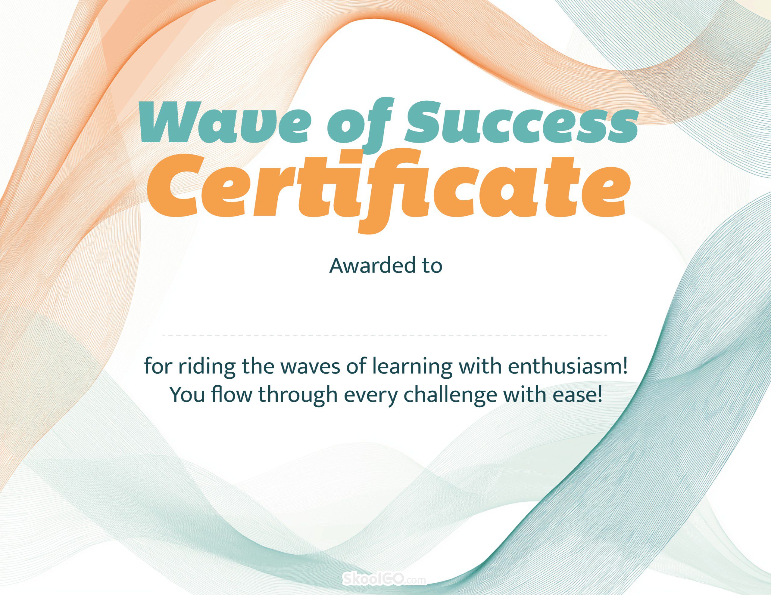 The Wave of Success Certificate features a modern and calming ocean-inspired design, with flowing wave illustrations in soft teal and warm orange tones. The dynamic curves create a sense of movement and growth, symbolizing how students progress through their learning journey with confidence and determination.